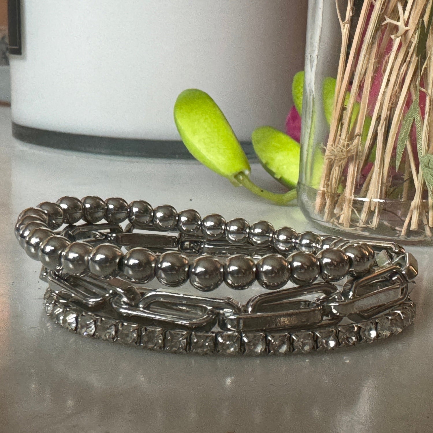 Lisa Stewart Jewelry Stretch Bead/Crystal/Chain Bracelet Set - White Gold